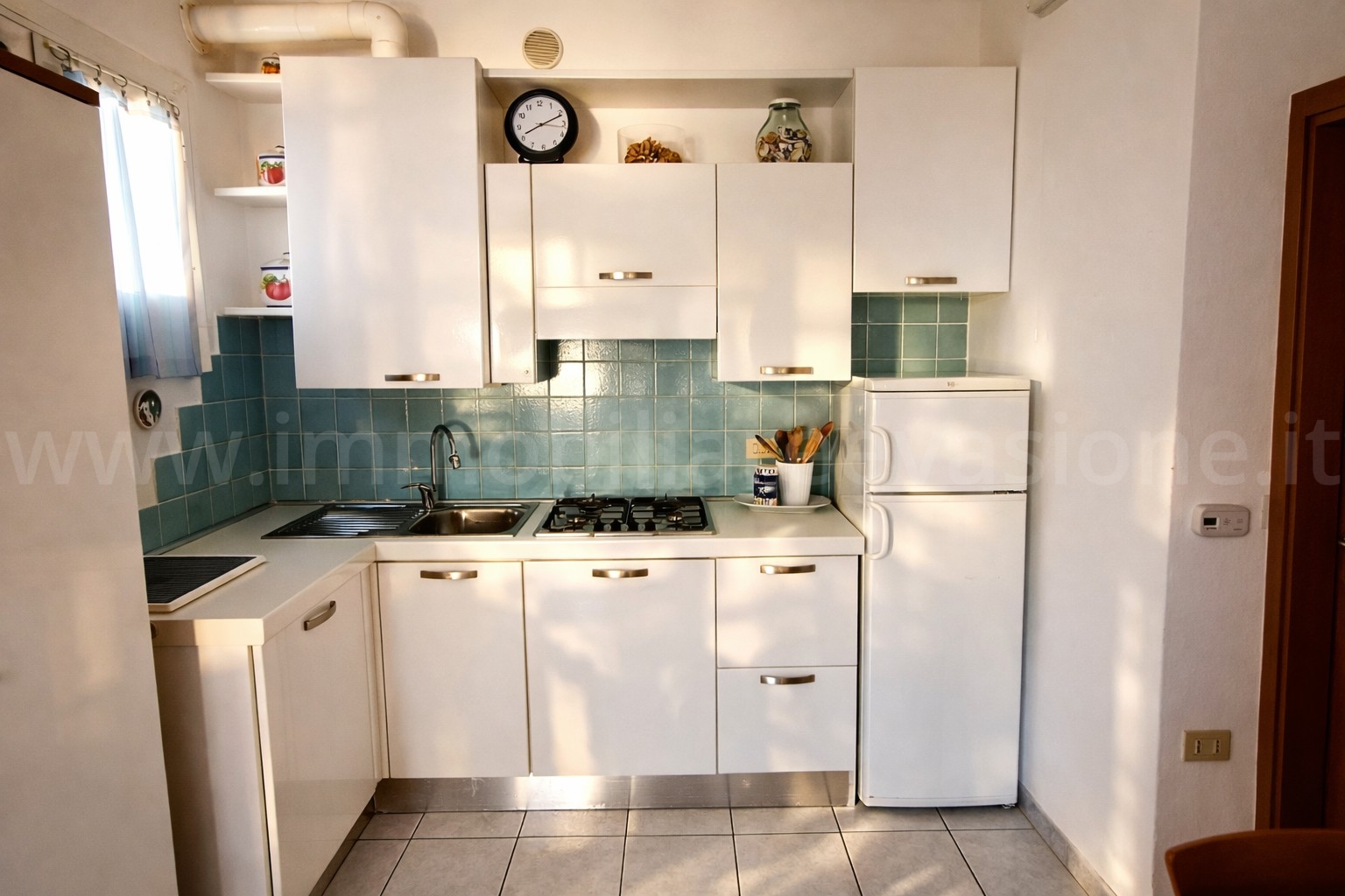 - CUCINA A VISTA attrezzata con PIANO COTTURA A GAS, FRIGORIFERO CON CELLA FREEZER, LAVASTOVIGLIE e LAVATRICE.