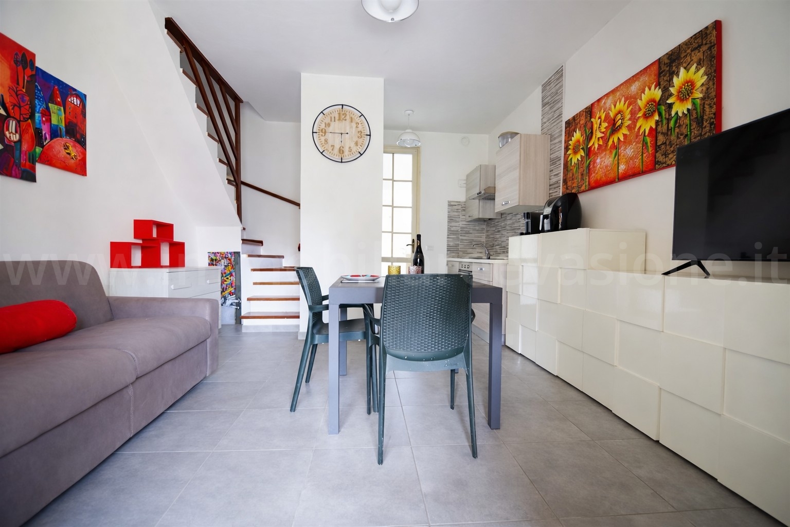 Entrando nell’abitazione si accede alla zona giorno composta da pranzo-soggiorno con cucina a vista, ambiente luminoso e funzionale, oltre ad un bagno al piano terra.