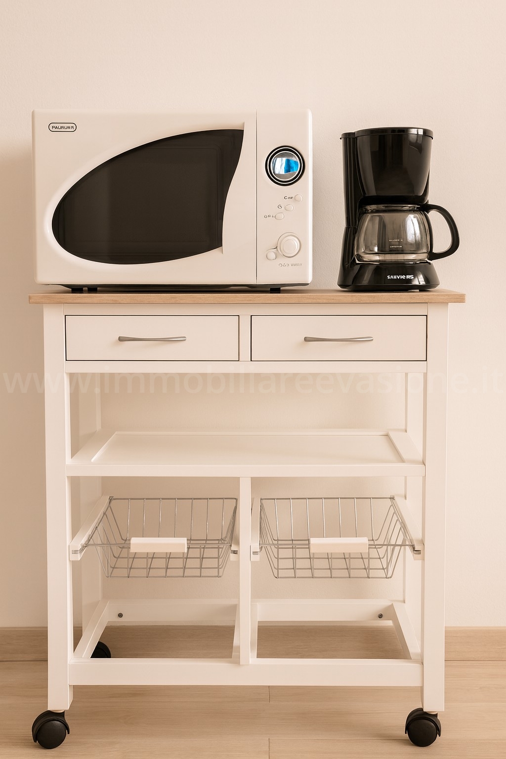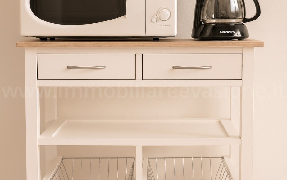 cucina completa di piano cottura a induzione, forno a microonde, macchina per il caffè americano, frigorifero con cella freezer e lavatrice.