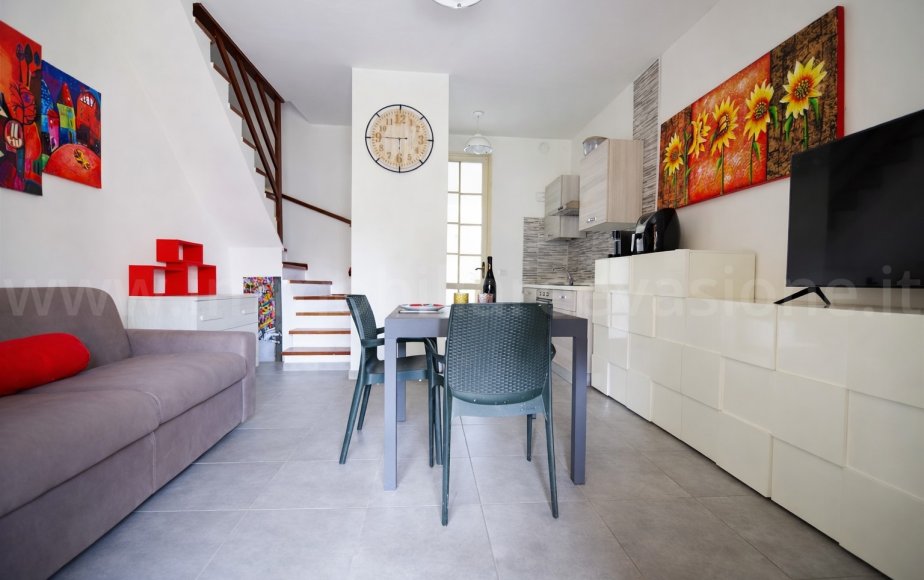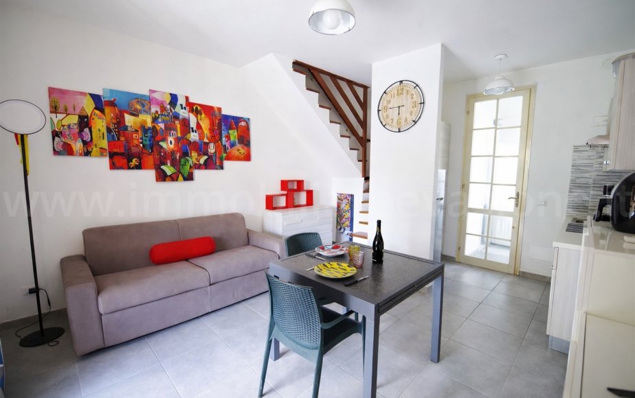 Entrando nell’abitazione si accede alla zona giorno composta da pranzo-soggiorno con cucina a vista, ambiente luminoso e funzionale, oltre ad un bagno al piano terra.